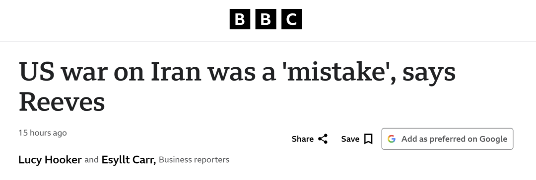 与此同时,财政大臣里夫斯也把伊朗战争称为“一个错误”,并表示自己“并不相信这场冲突让世界变得更安全了”。