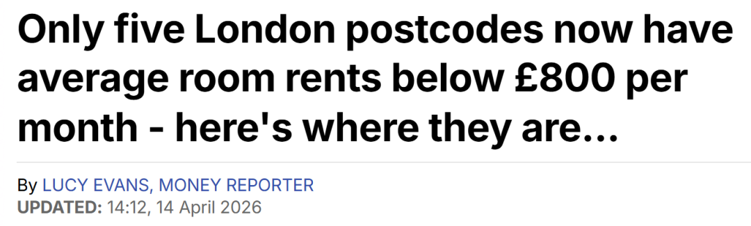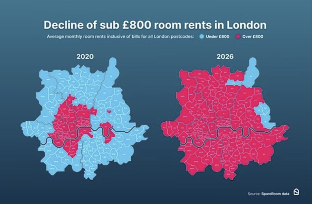 ● SpareRoom:伦敦月租800英镑以下邮区只剩5个