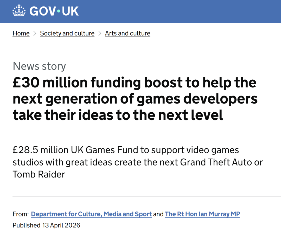 4月13日,英国政府启动了最新阶段的游戏增长计划(Games Growth Package),通过英国游戏基金(UK Games Fund)拨款2850万英镑,支持早期开发者和游戏工作室的成长。